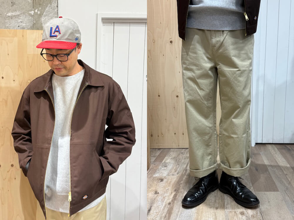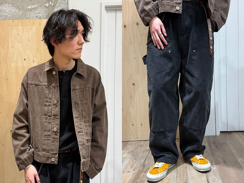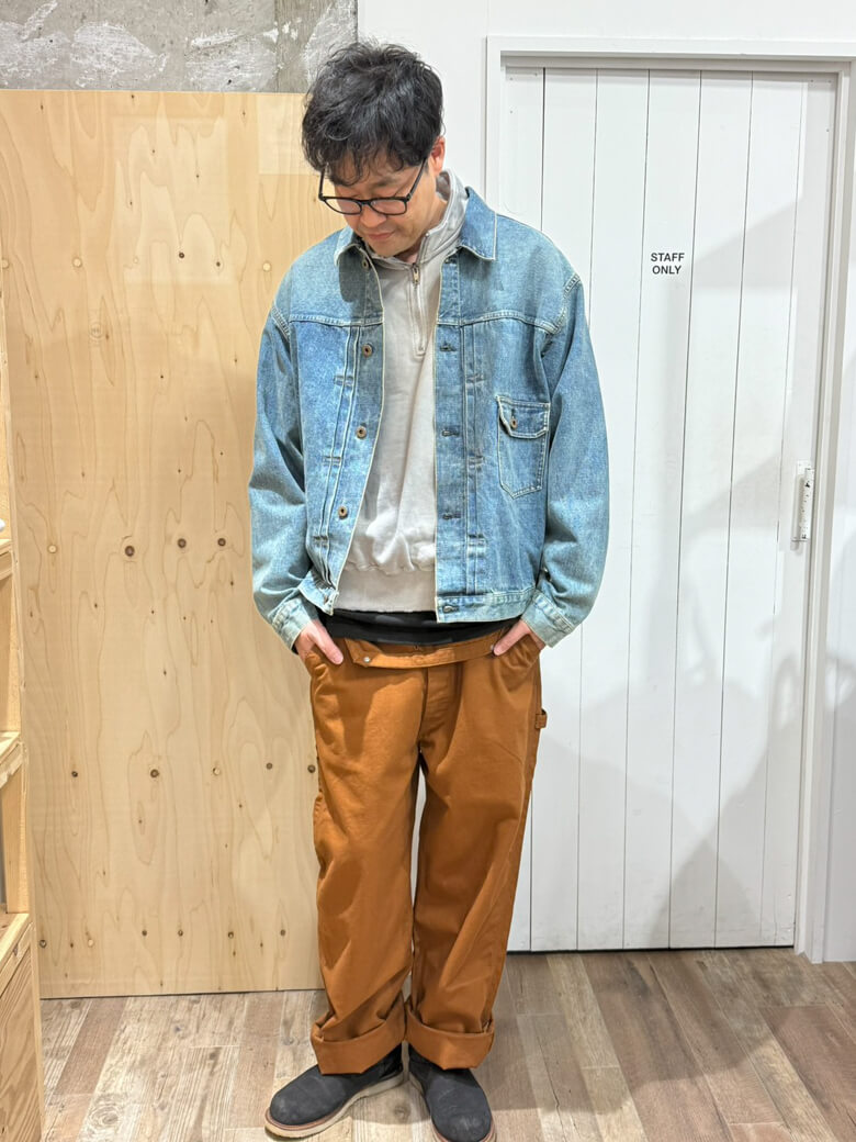 ボトムスはダブルニーのワイドペインターパンツで上下のバランスを調整。