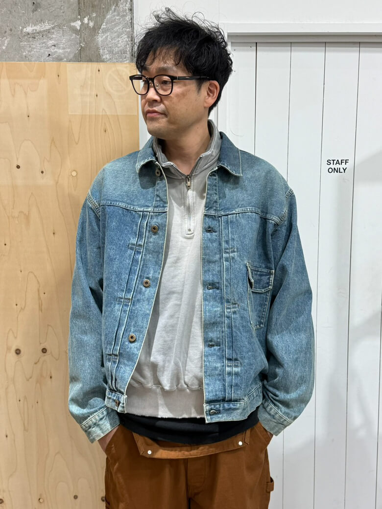 インナーには古着っぽい加工が絶妙なハーフジップトレーナーを合わせて、シンプルになりすぎないようにしています。