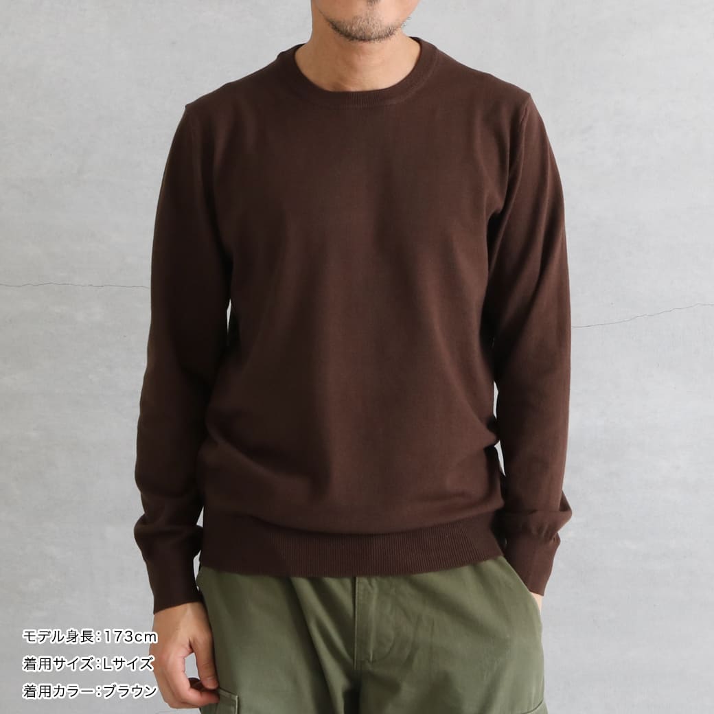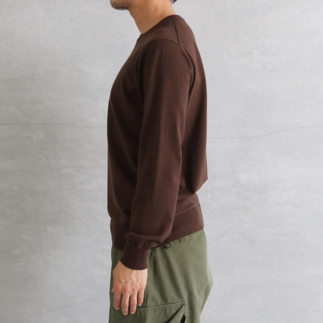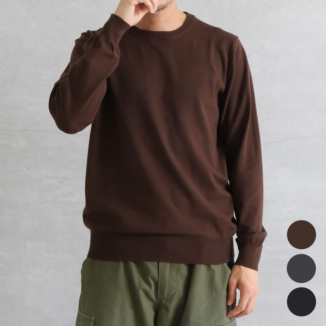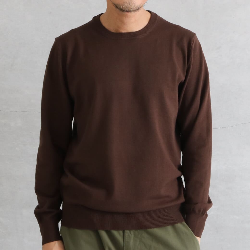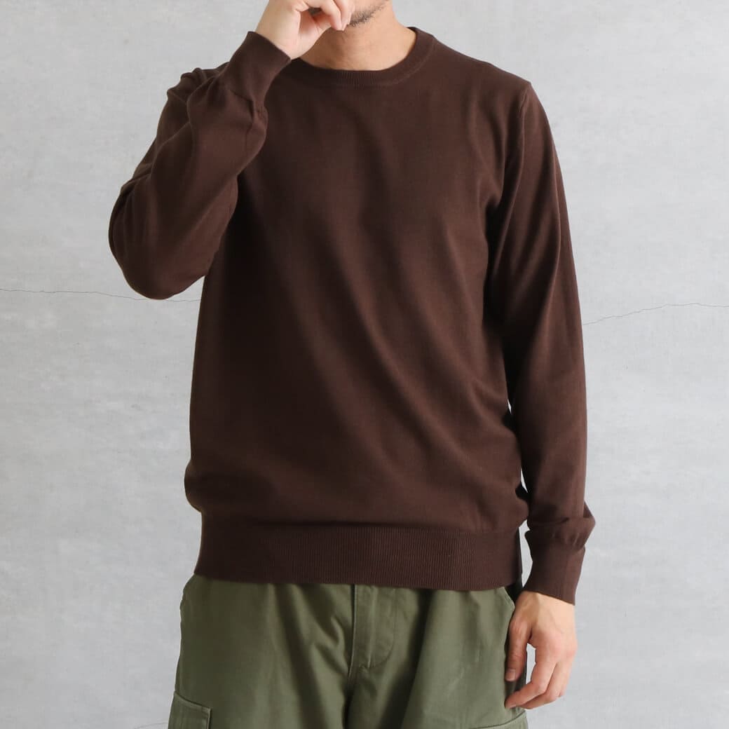シンプルなクルーネックは、シャツやTシャツとのレイヤードも簡単。