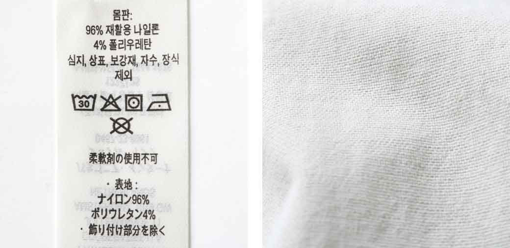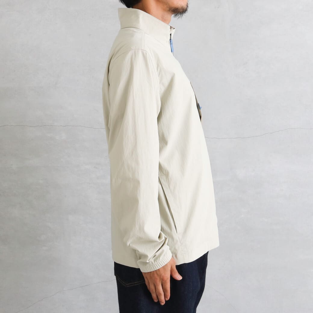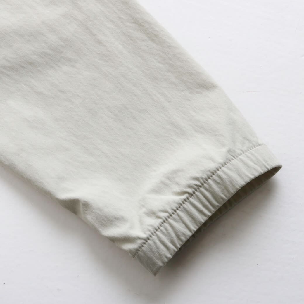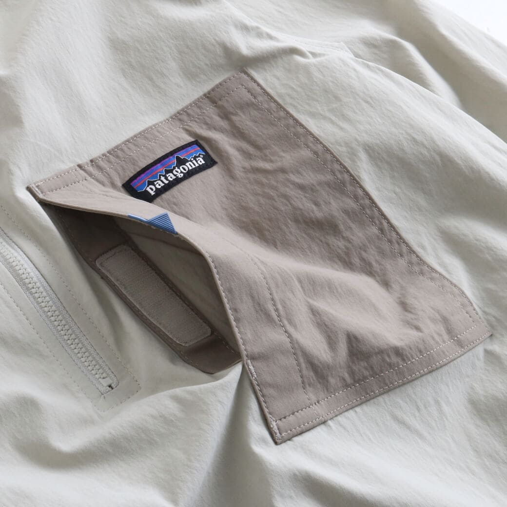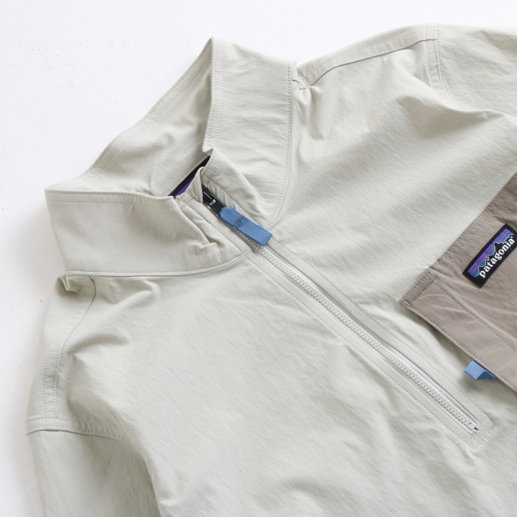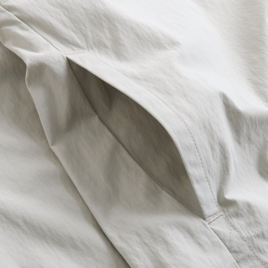素材は漁網をリサイクルして海洋プラスチック汚染の削減に貢献する、平織りのネットプラス・ポストコンシューマーリサイクル・ナイロン96%/ポリウレタン4%。PFASを意図的に使用せずに製造されたDWR(耐久性撥水)加工済みで、UPF(紫外線防止指数)40+のUVプロテクションを提供。フェアトレード・サーティファイドの工場で製造。