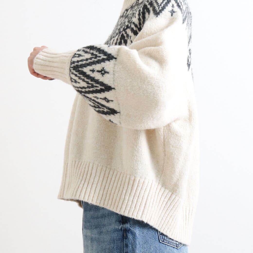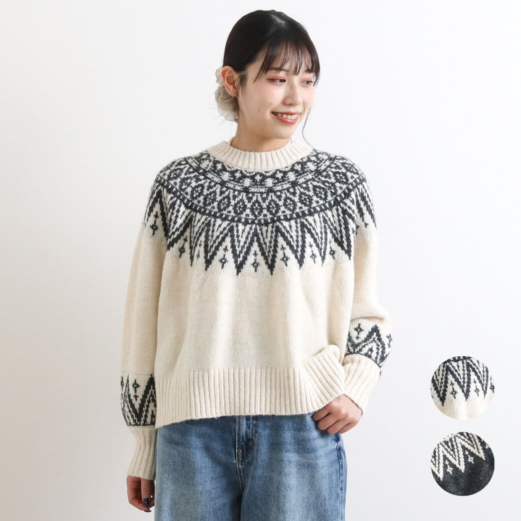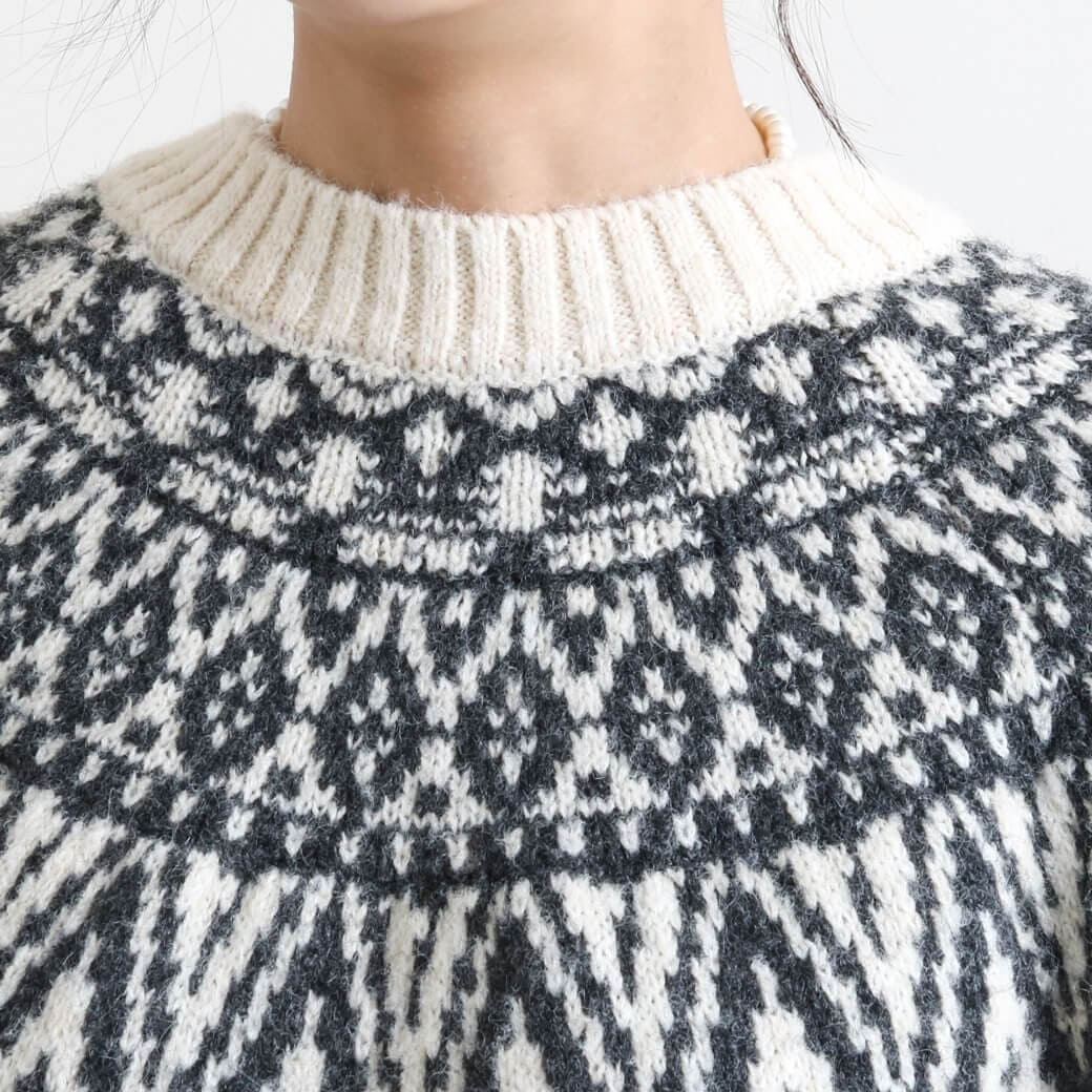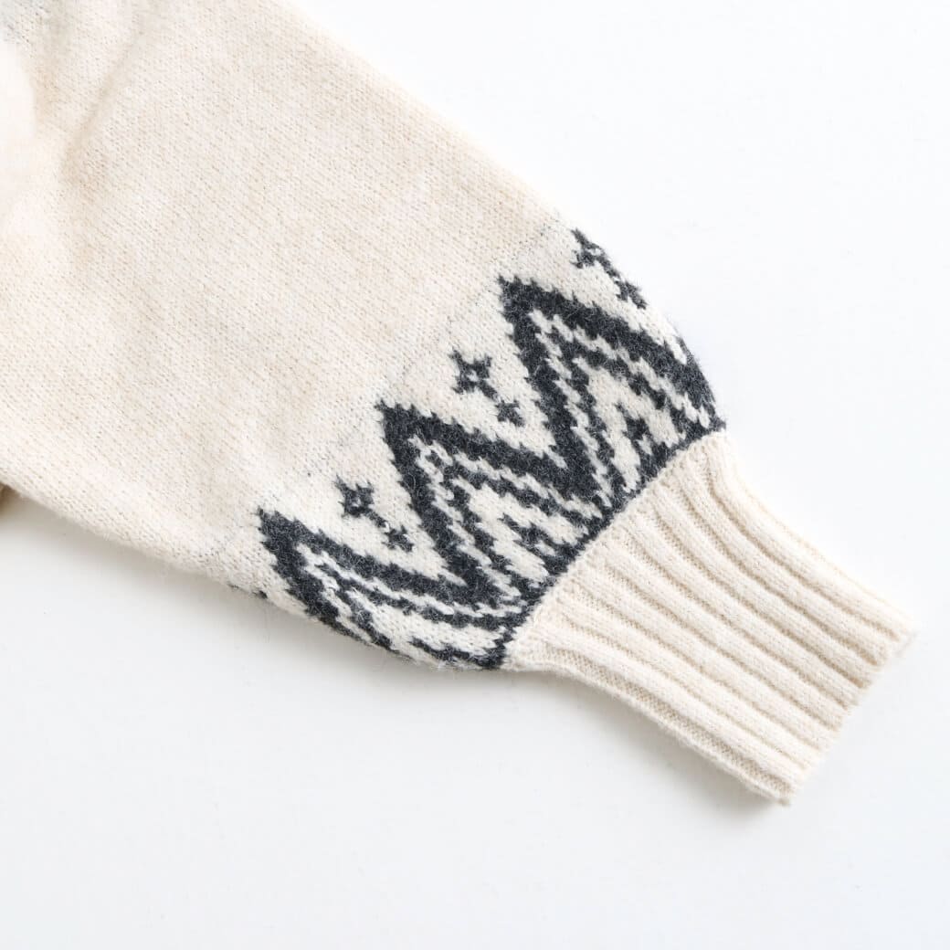 首元と手首の柄がアクセントになり、コーディネートの主役になる一枚です。