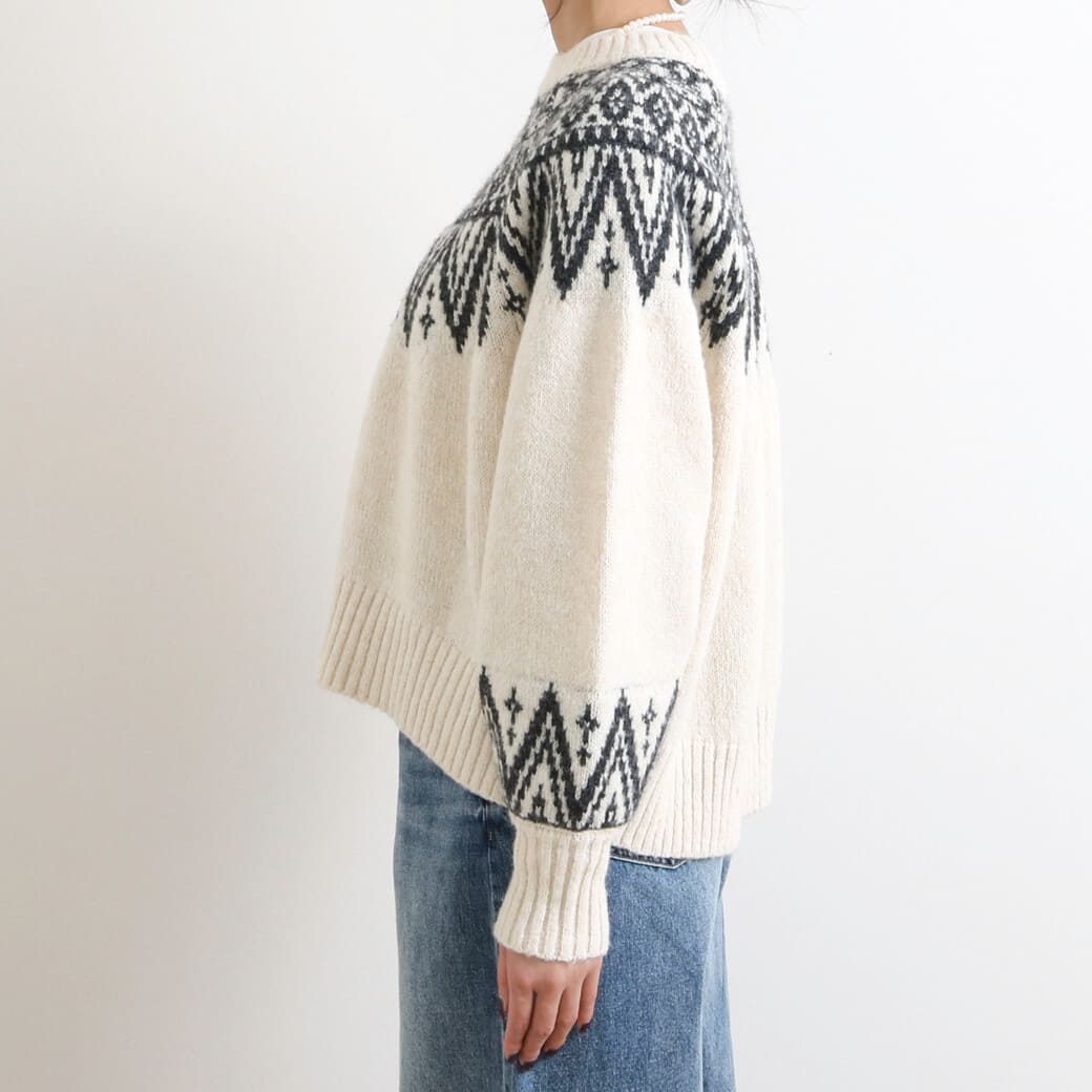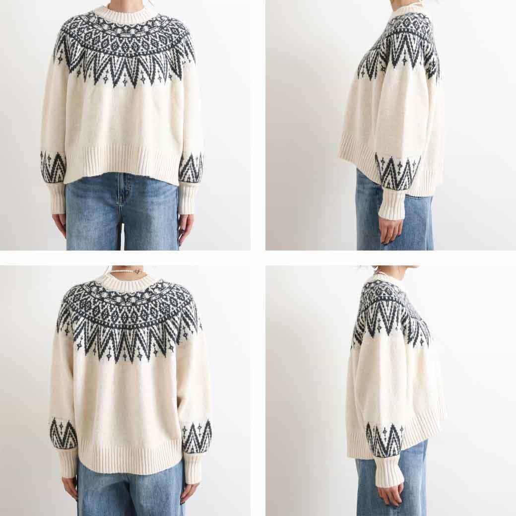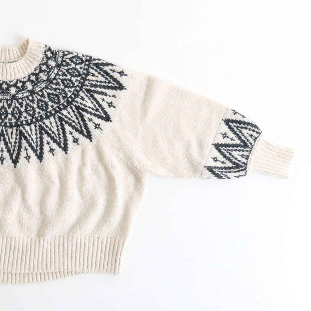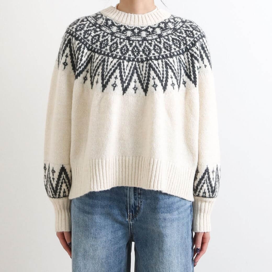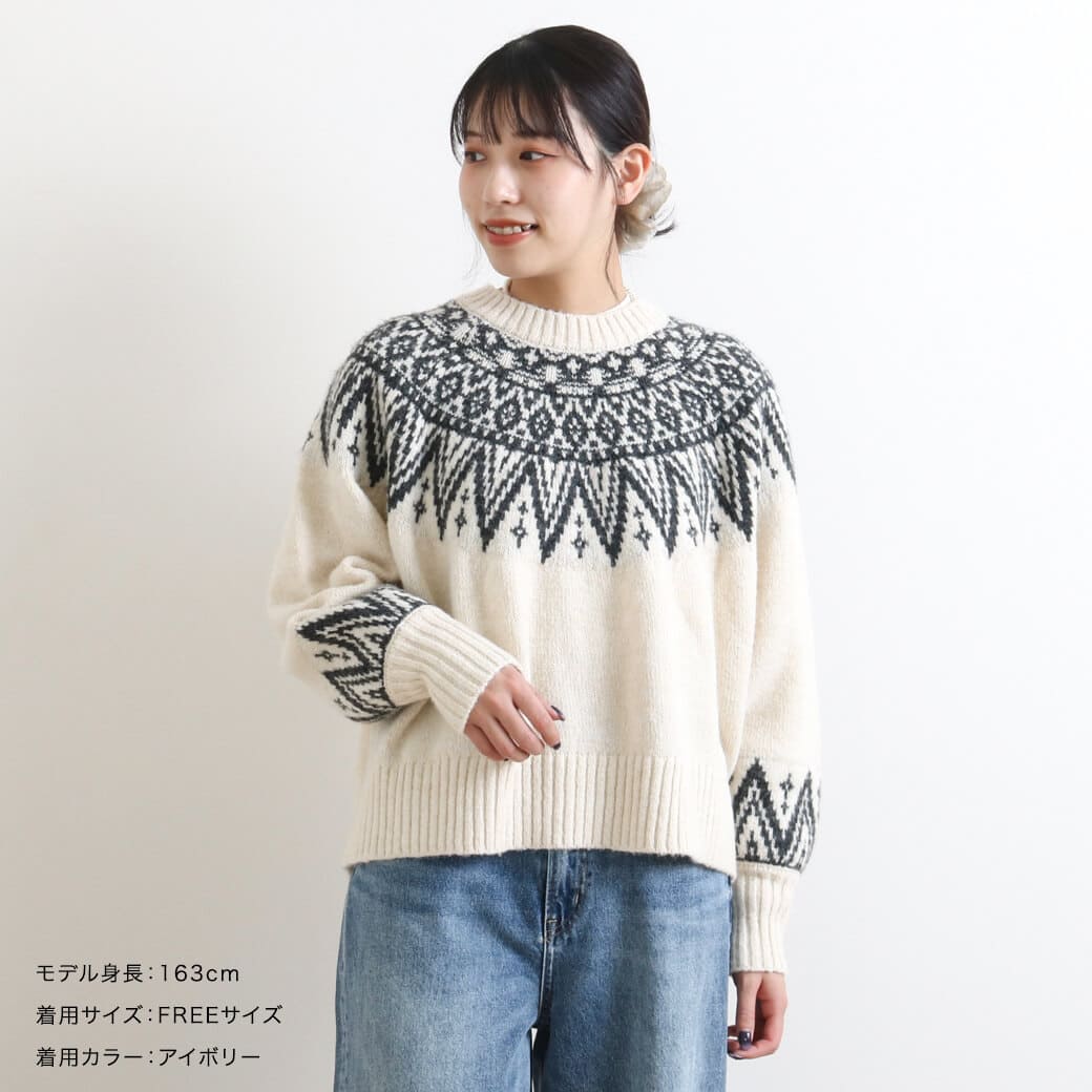 首元と手首の柄がアクセントになり、コーディネートの主役になる一枚です。