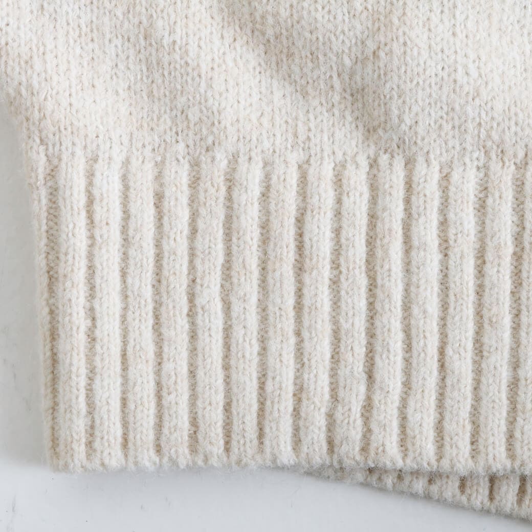 袖は、動きやすいラグランスリーブで、デニムやスカートなどカジュアルスタイル合わせていただきやすいニットです。