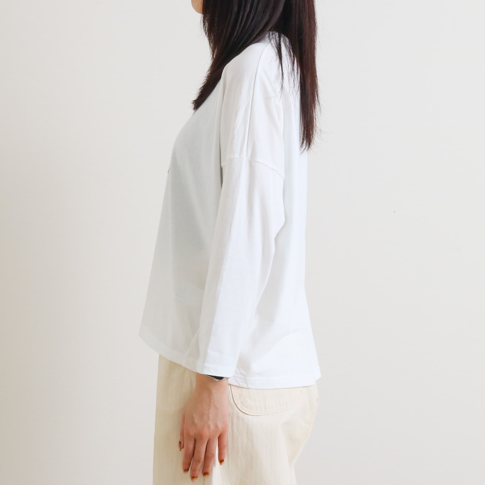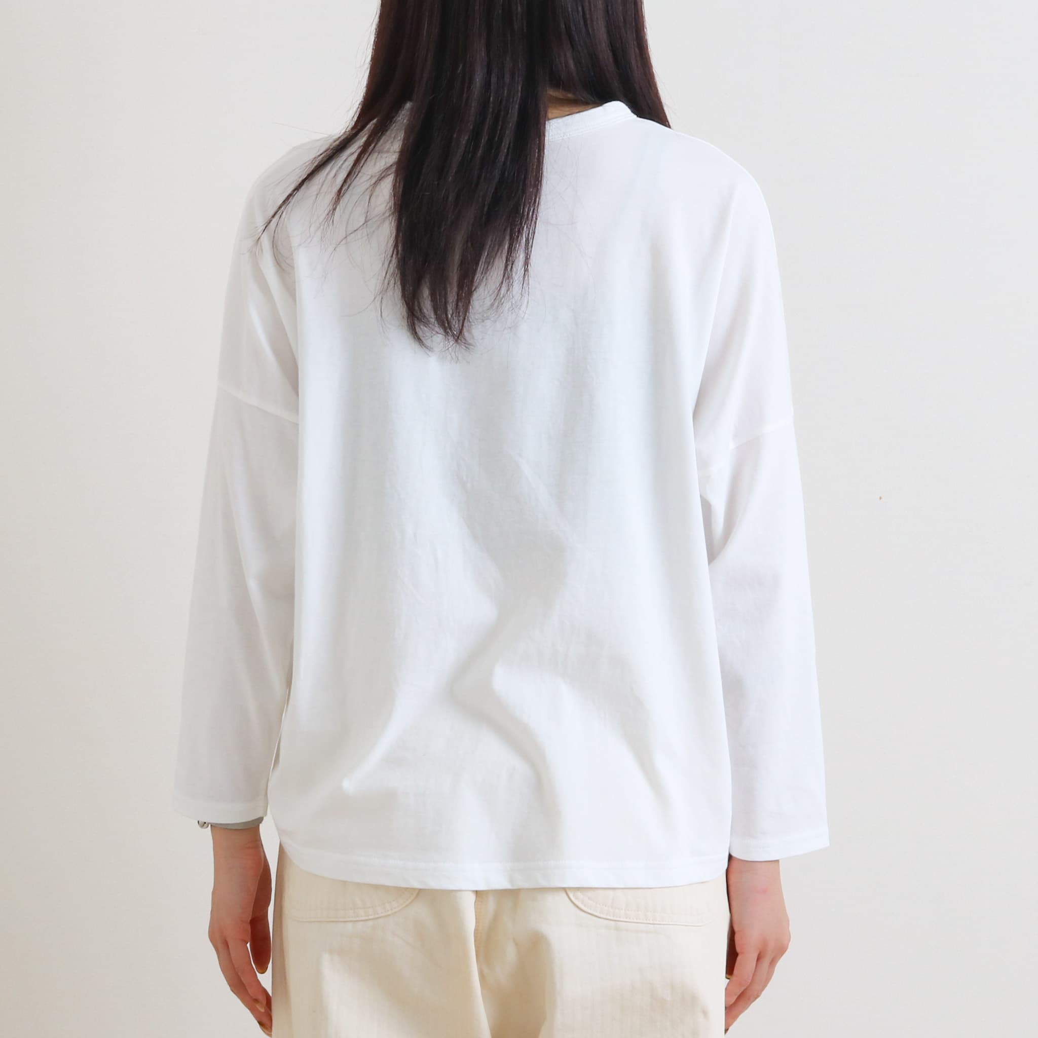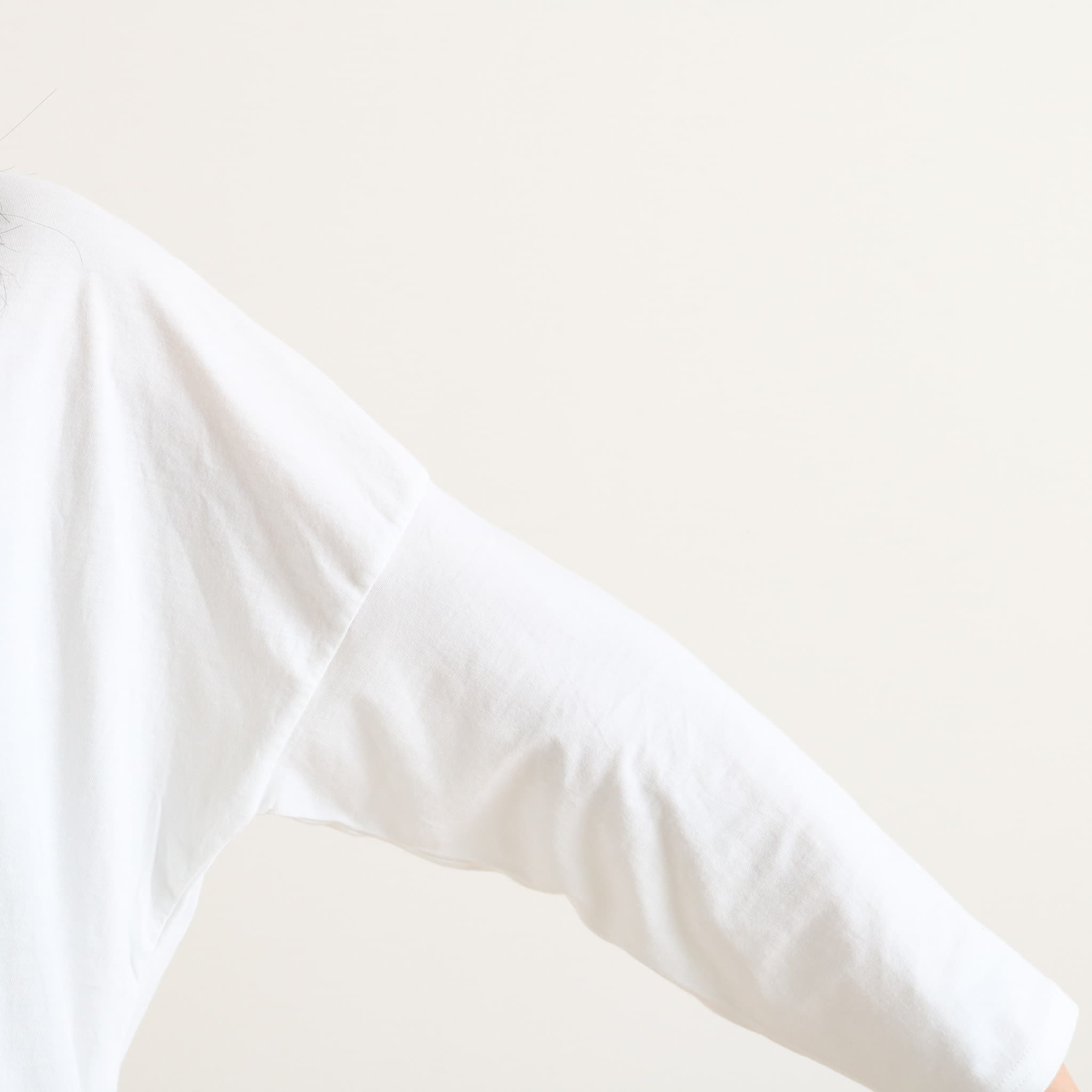 薄手の生地感で、楽に着られました。 袖は腕回りゆったりで、着心地抜群です。 1枚でもインナーでも着られて、ロングシーズン活躍しそうです。 |