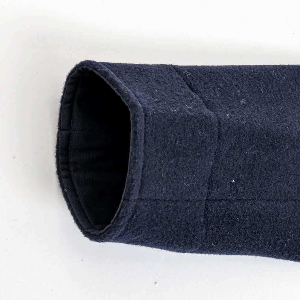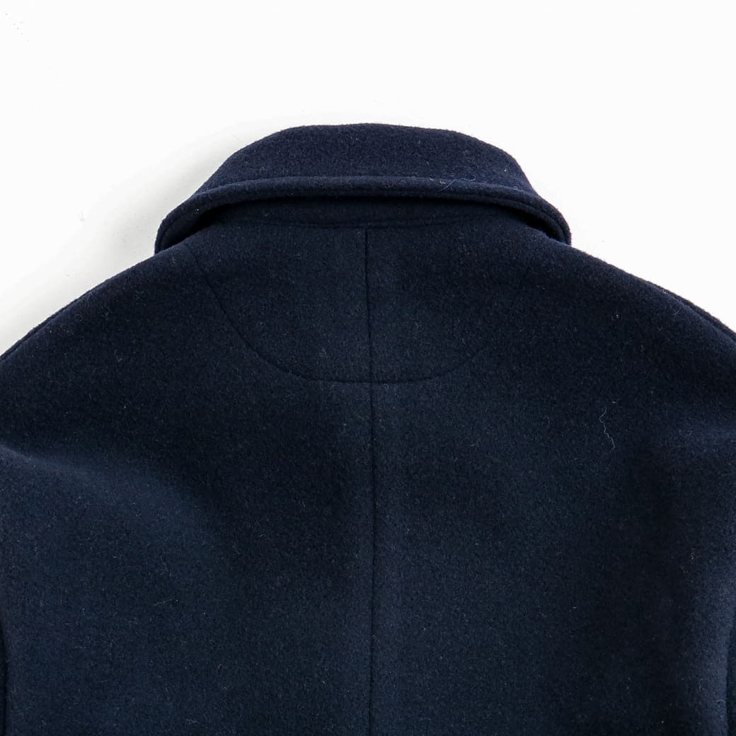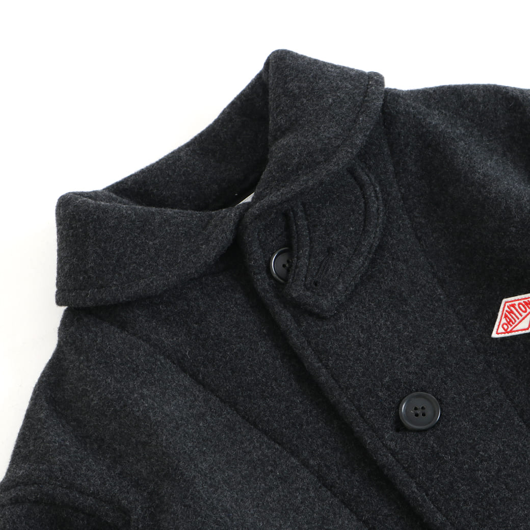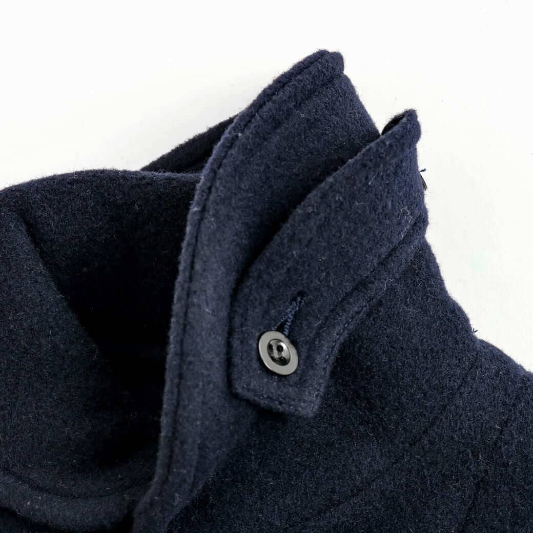 ラウンドカラーの内側にはチンベルトを配しているので、襟を立てて、ベルトを止めても印象が変わって◎