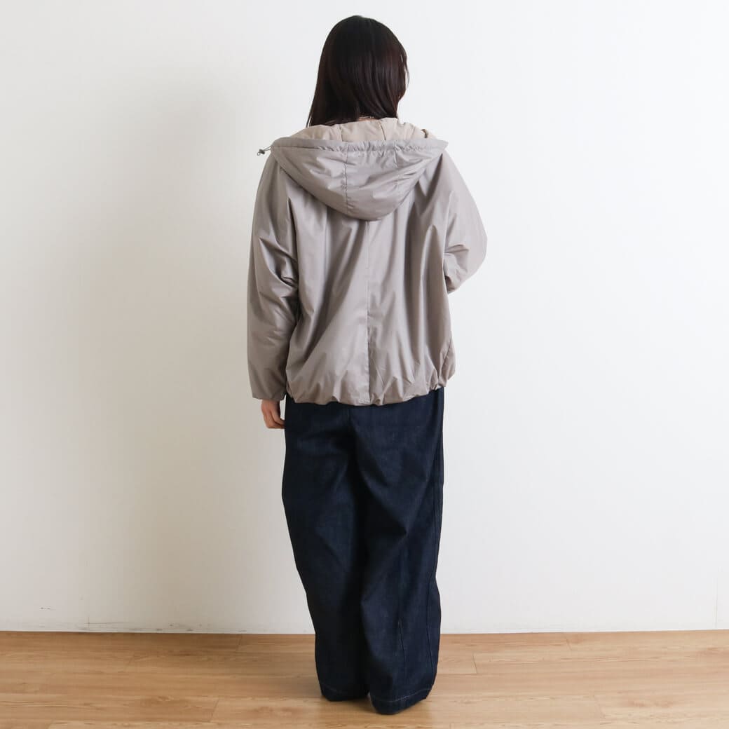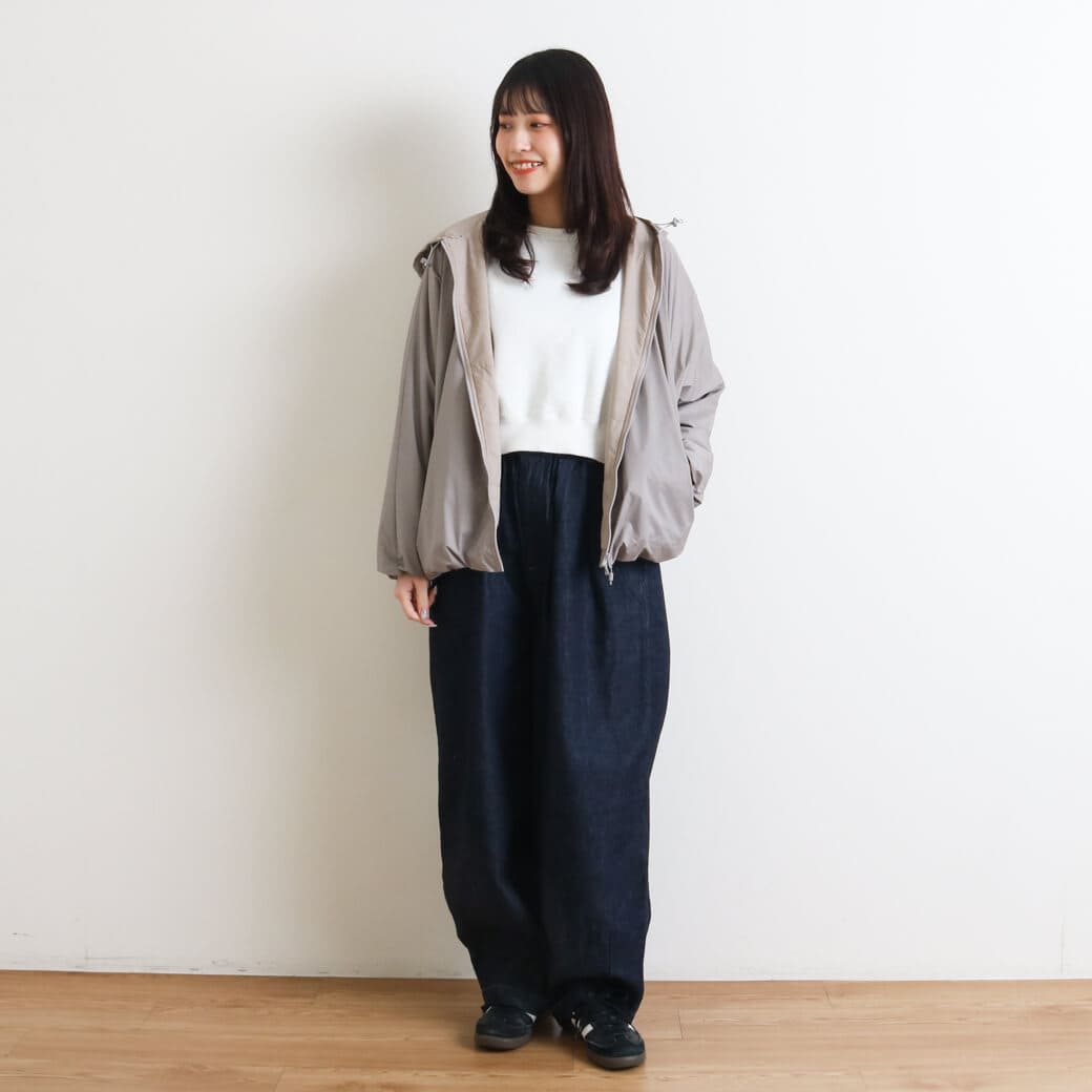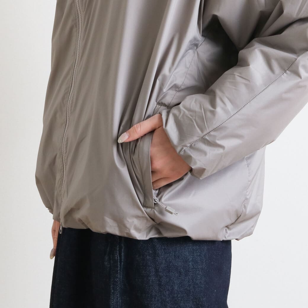 フロントはダブルジップ仕様で、袖はドルマンスリーブなので、インナーに厚手のトップスに合わせても◎