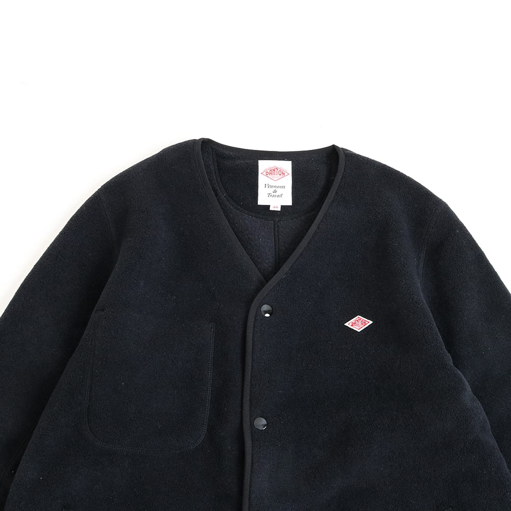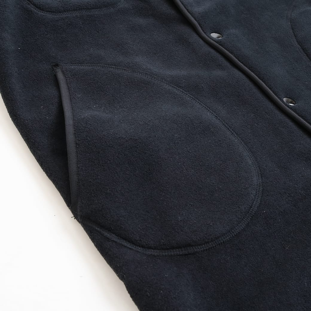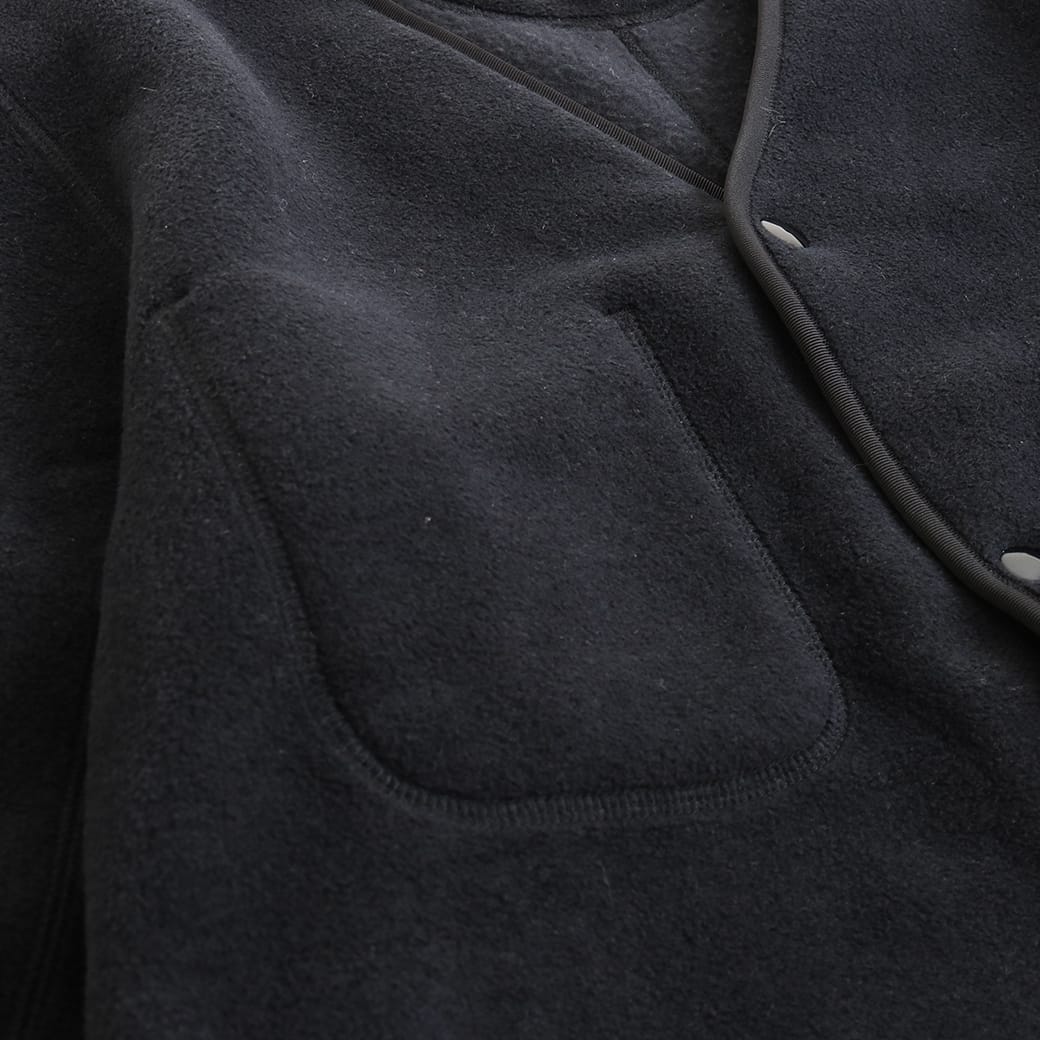 内側にあしらわれた胸ポケットやラウンド型のポケットなど基本的なデザインはそのままに、ロングタイプは首元をVネックに仕上げ、シャツやハイネックなどのトップスとのレイヤードスタイルをすっきりと見せてくれます。