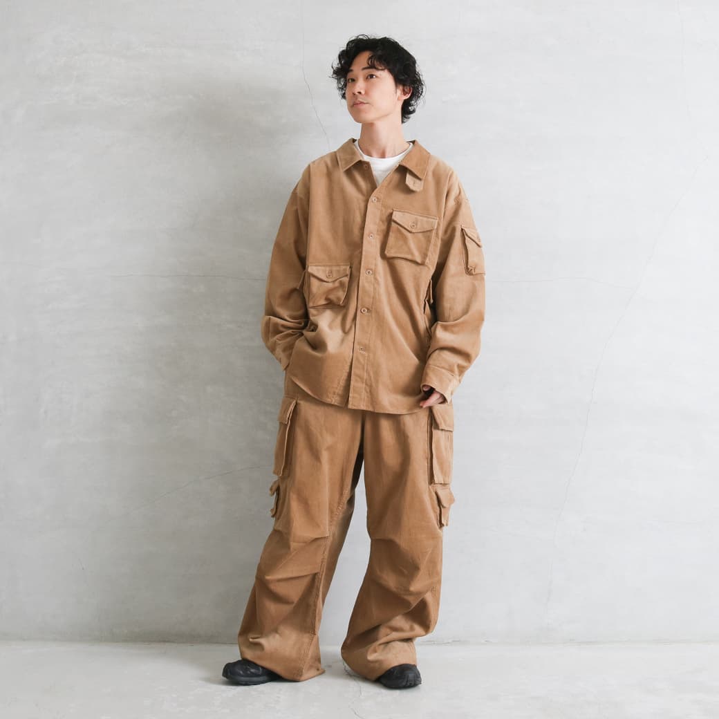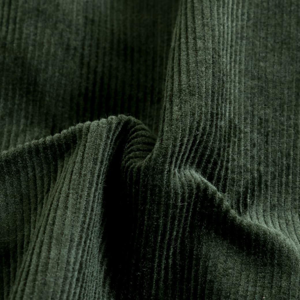 コーデュロイ特有の光沢感と凹凸のある表情がスタイリングに奥行きを与え、無骨さの中に上品さをプラス。