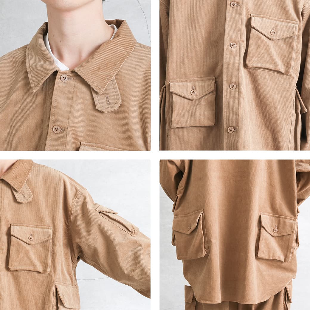 軍用シャツジャケットをベースに、ディテールをさらに強調し多目的ポケットを追加したデザイン。