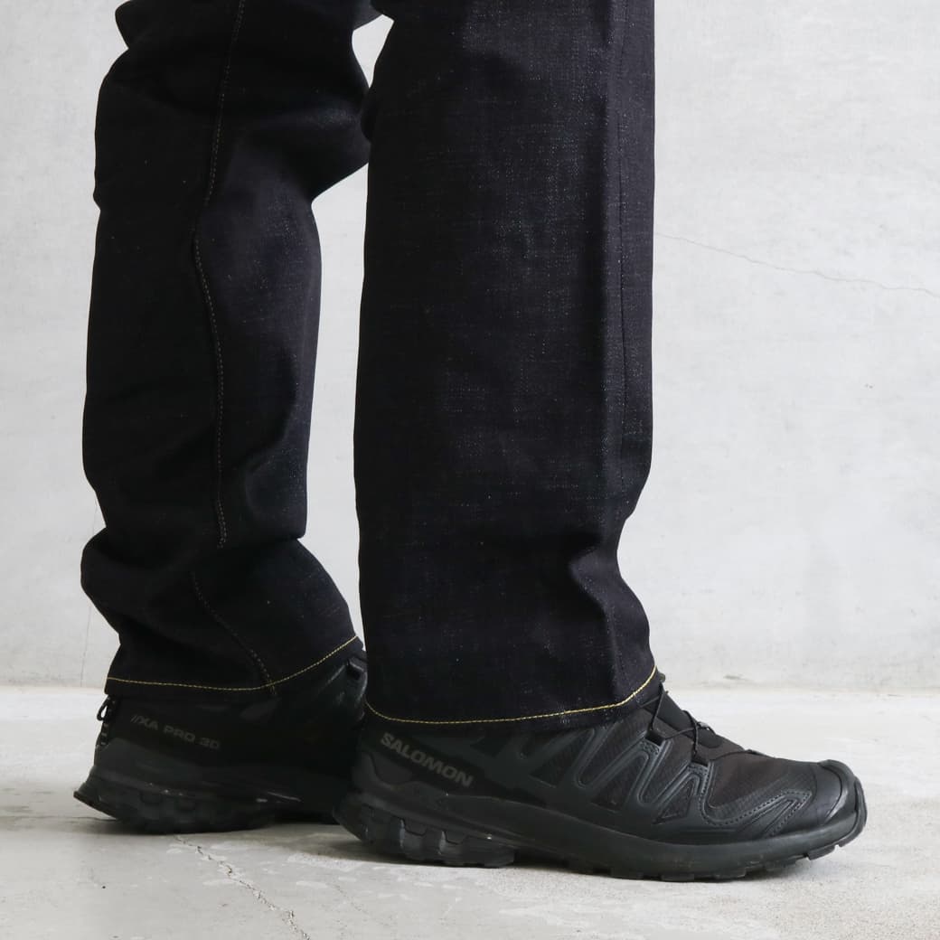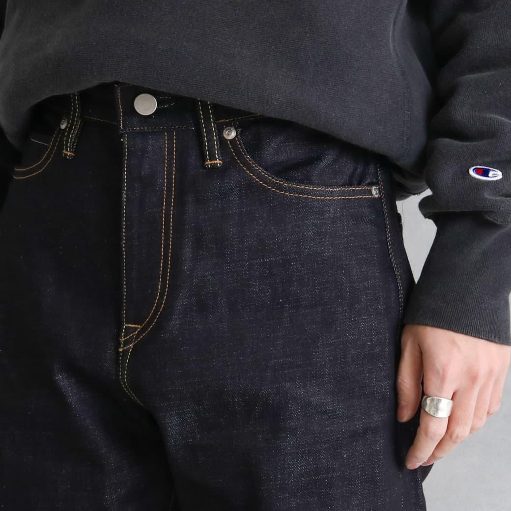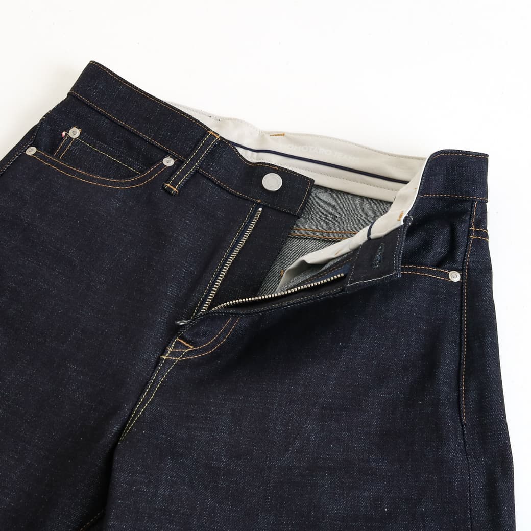 洗濯後の縮みを抑える加工が施されており、生デニムの良さを残しつつ扱いやすさも両立しています。