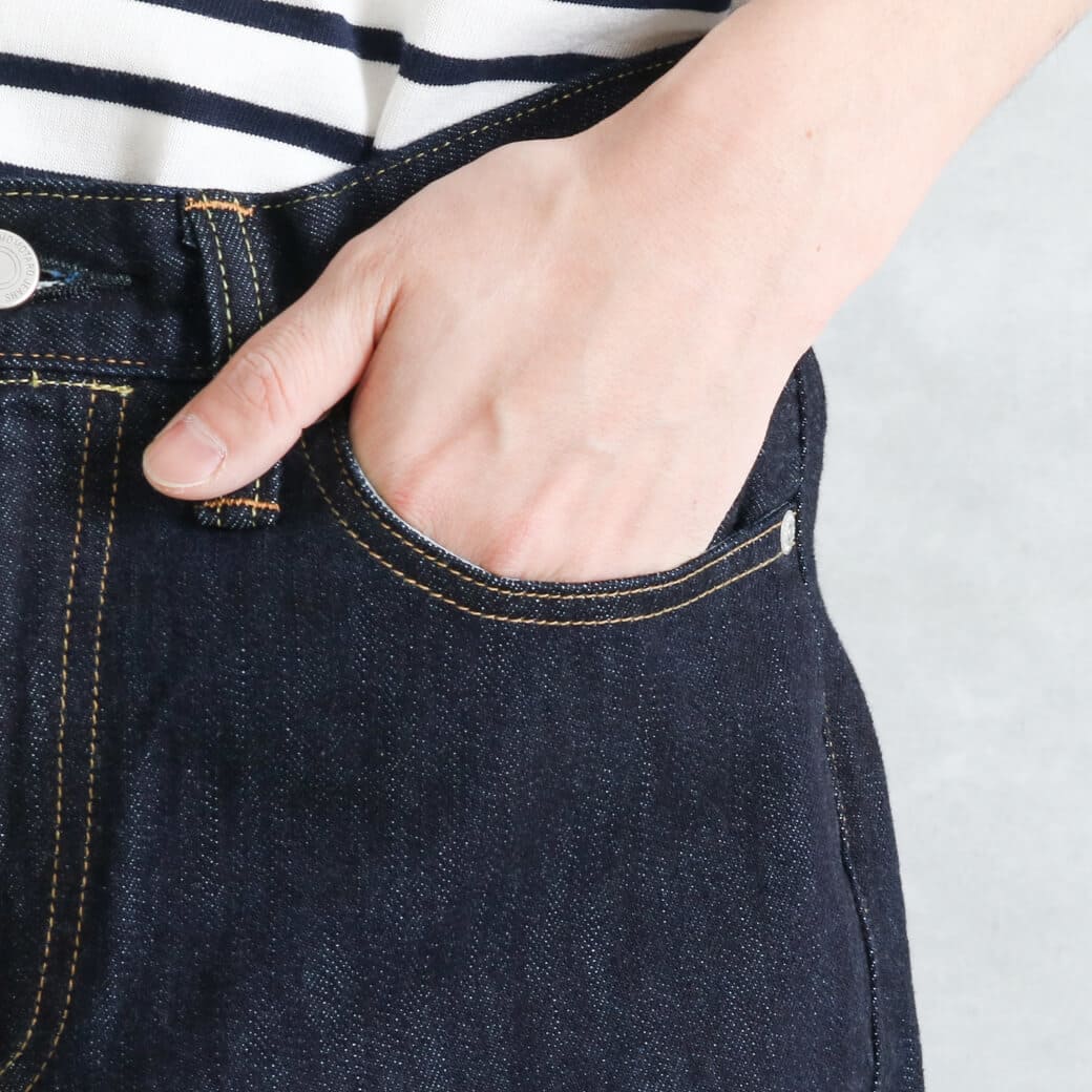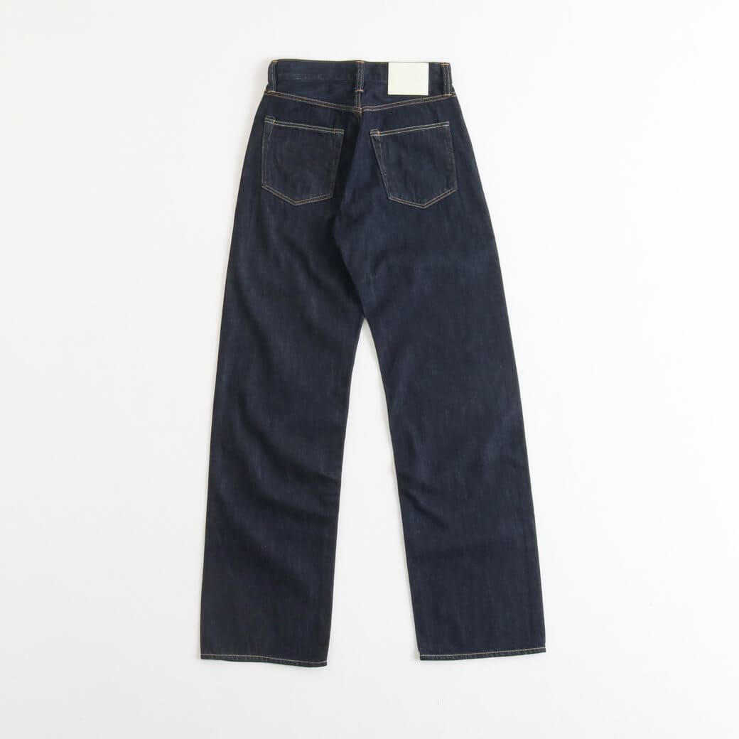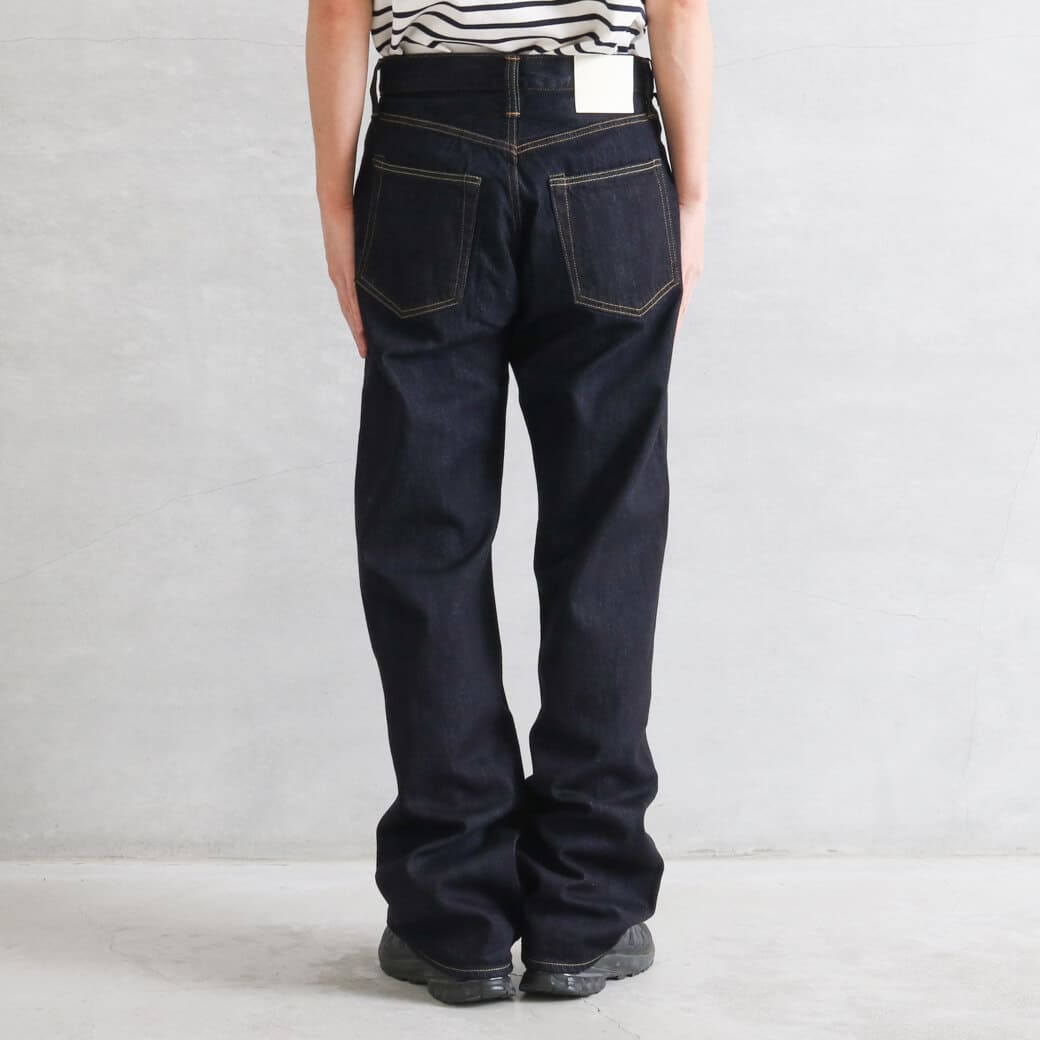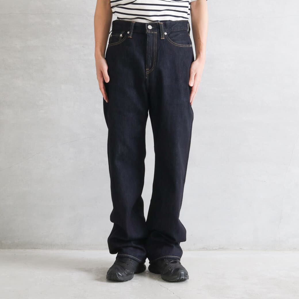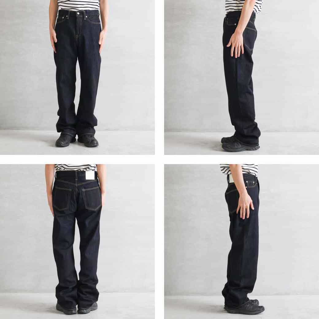 ゆったりとした太ももをベースに、膝下にかけてごく緩やかなテーパードをきかせたワイドストレートシルエット。股上が深く、腰回りをゆったりと包み込む構造。
