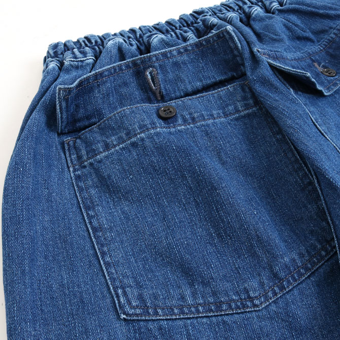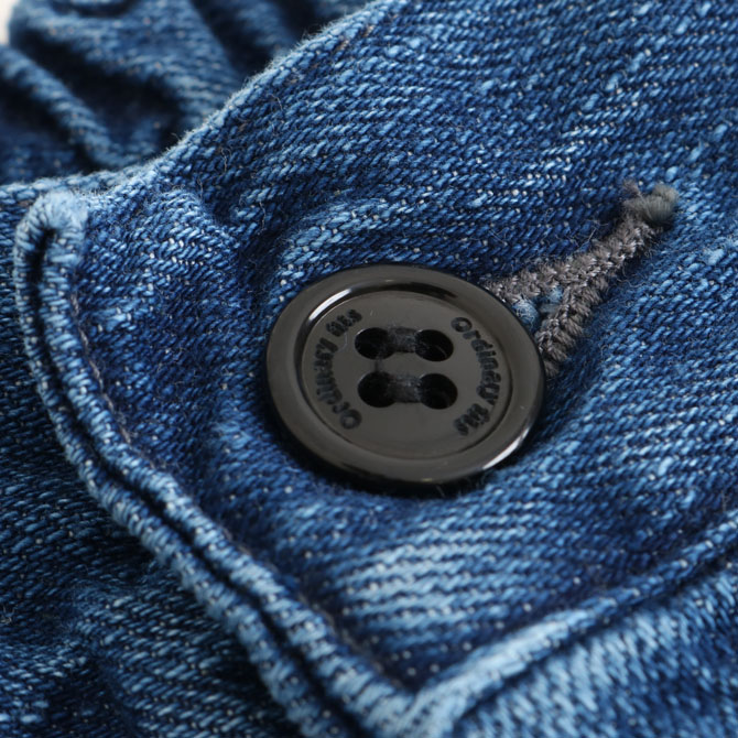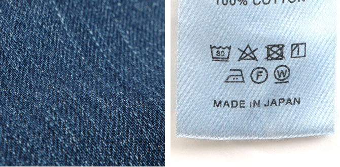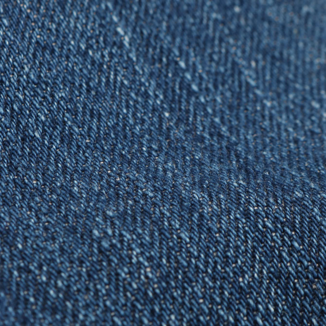 タテ糸に落ち綿を使用した自然なネップ糸を使用、インディゴの色は藍染のブルーに限りなく近いさやしい青味が出るインディゴ色でロープ染色を施しています。