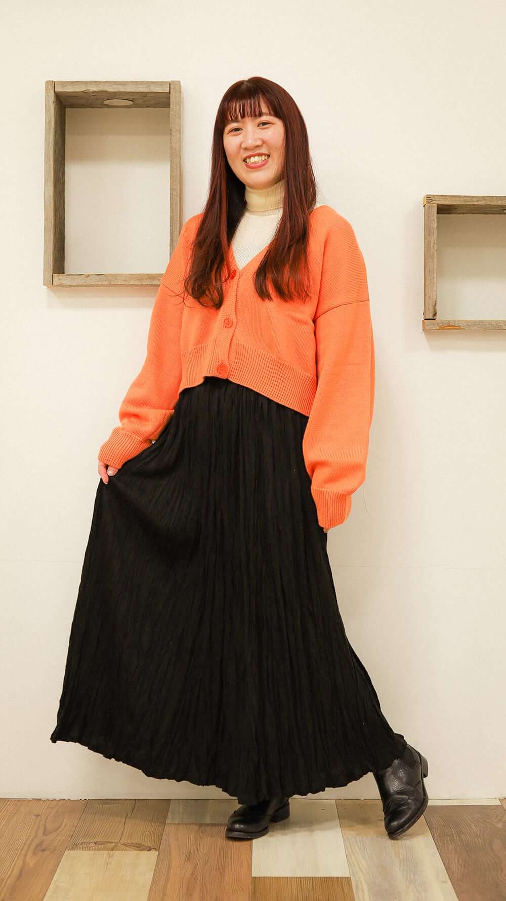クロップド丈のカーディガンとスカート合わせでスタイルアップ効果抜群!!