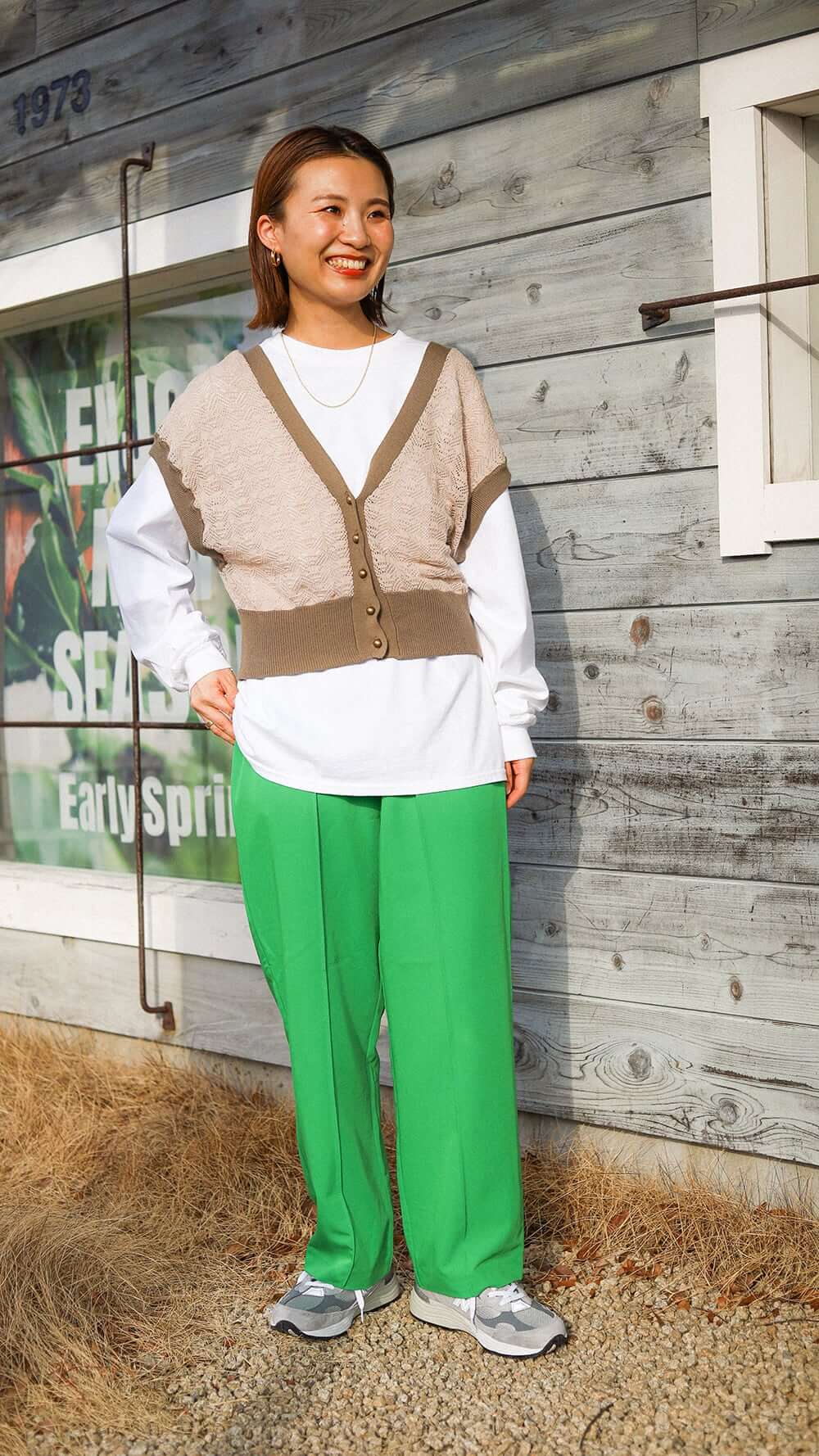 普段着ているような、カラーのパンツに、オーバーサイズのロンTにビスチェをプラス。