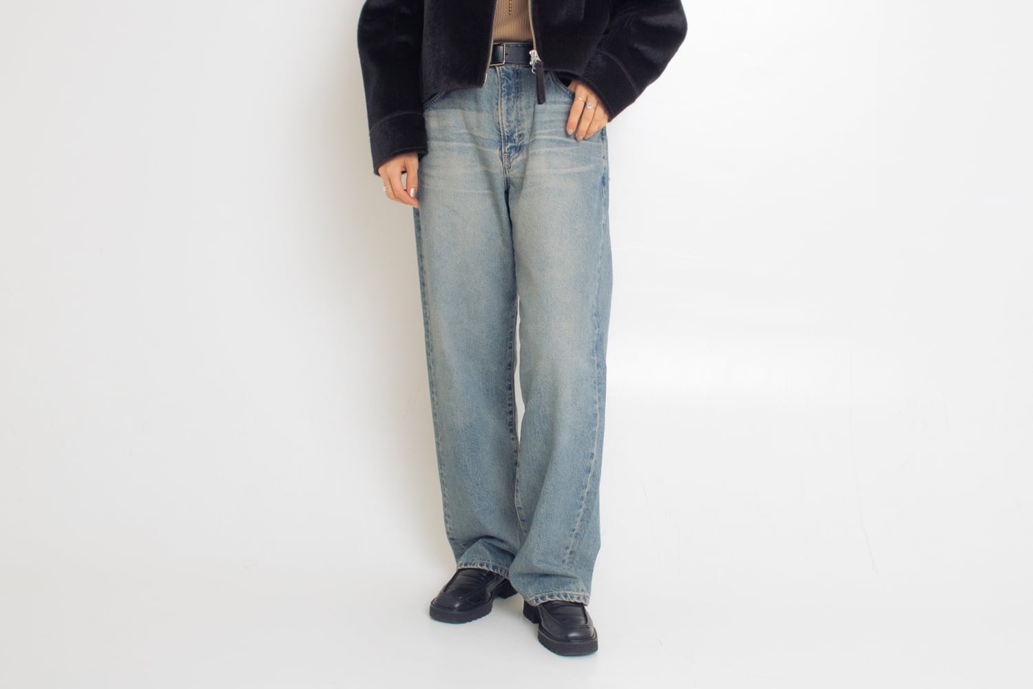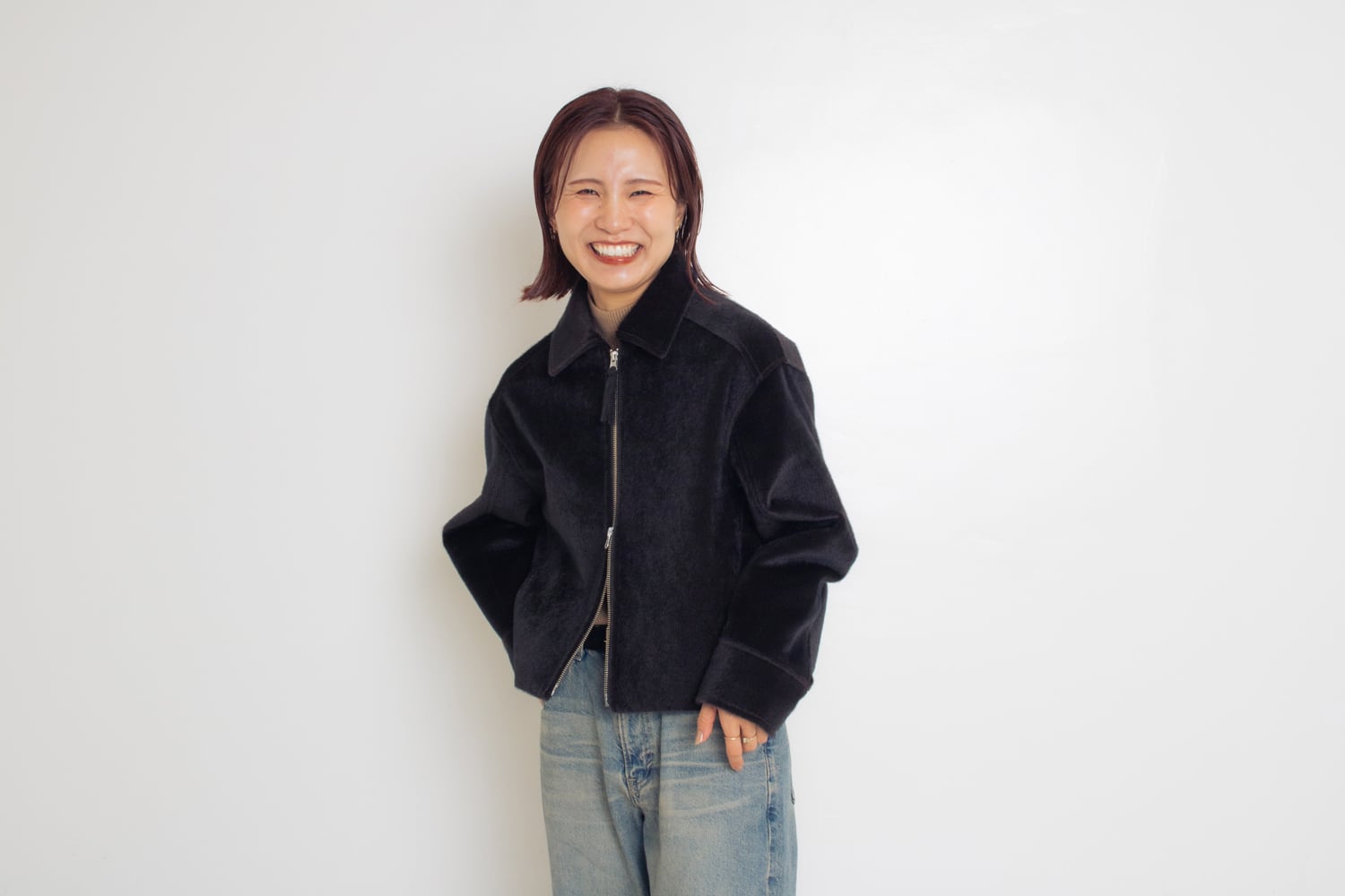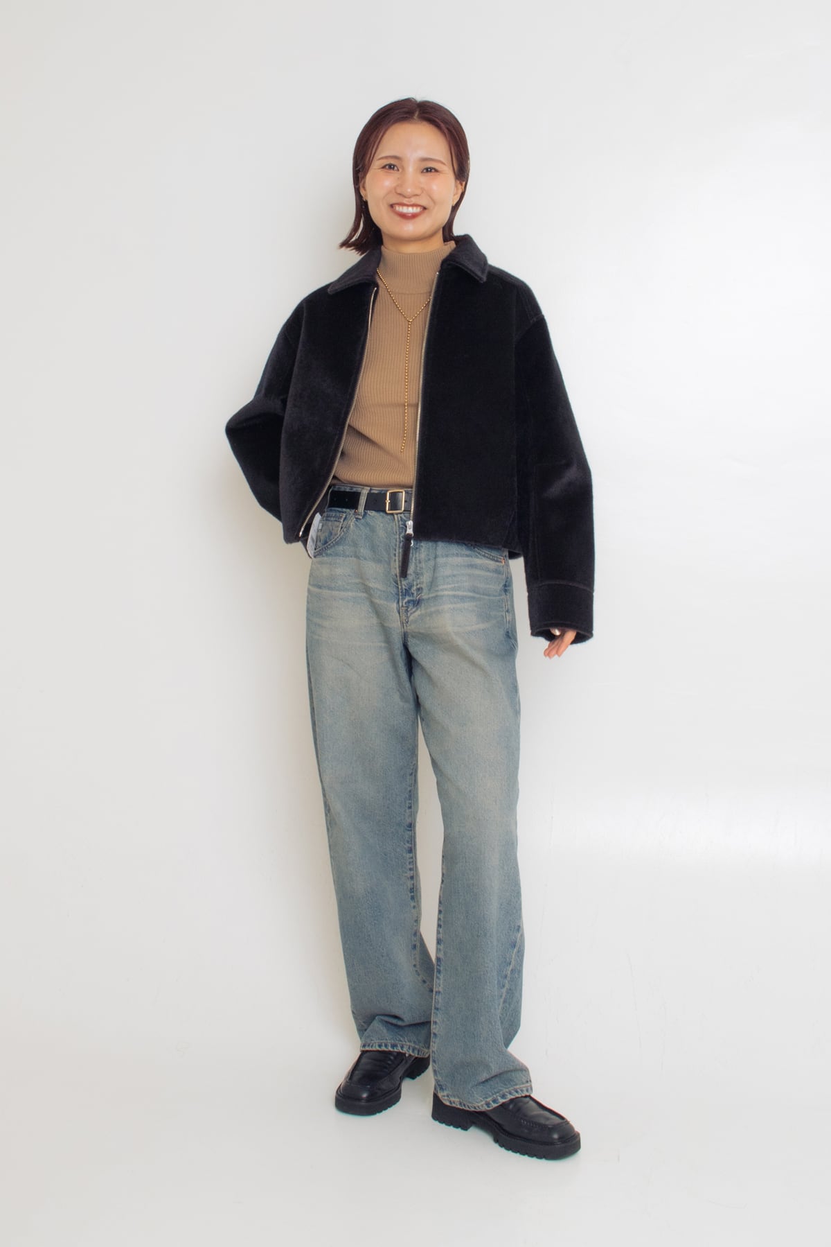 リアルなハラコの毛並みのような手触りが特徴的なジャケット。腰にかかるぐらいの丈感が絶妙で、バランスが取りやすくなっています。毛の光沢感が高級感をプラスしてくれます!デニムで少しラフなコーデに仕上げました。