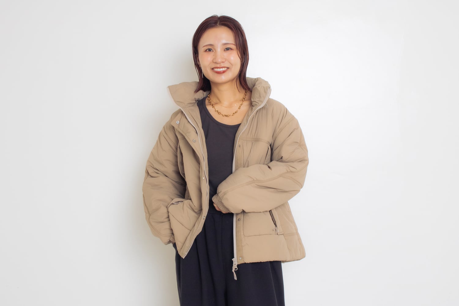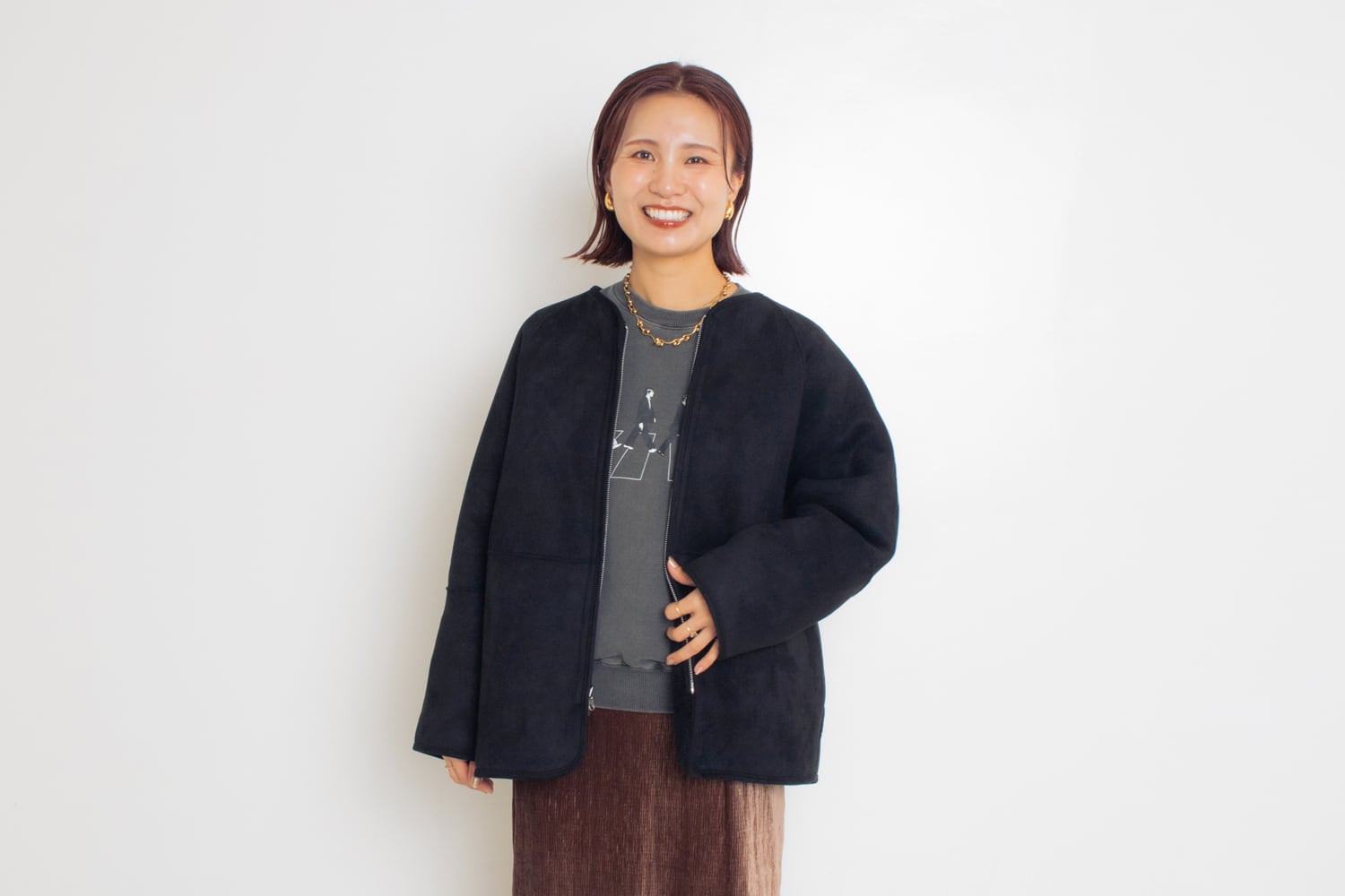 こちらはなんと、リバーシブルで着用できるアウターです!表はボア素材、裏はフェイクムートンの素材で表情の違いをお楽しみ頂ける1着です。リバーシブルなのに、なぜか大きく見えず、なぜかスッキリと見せてくれるんです。しかも羽織り心地も軽いですよ♪