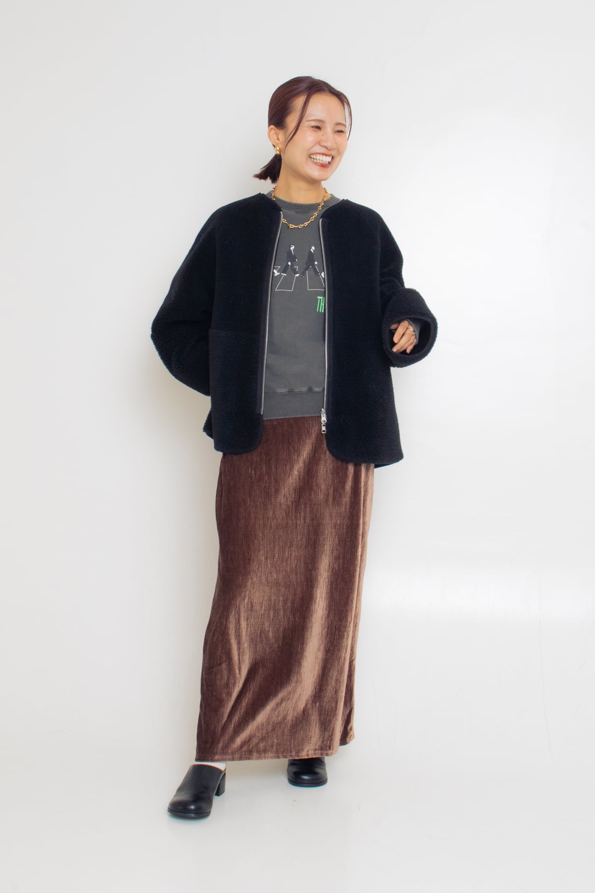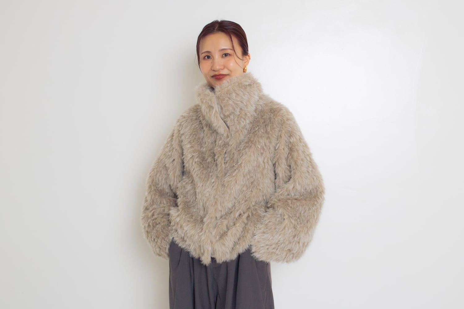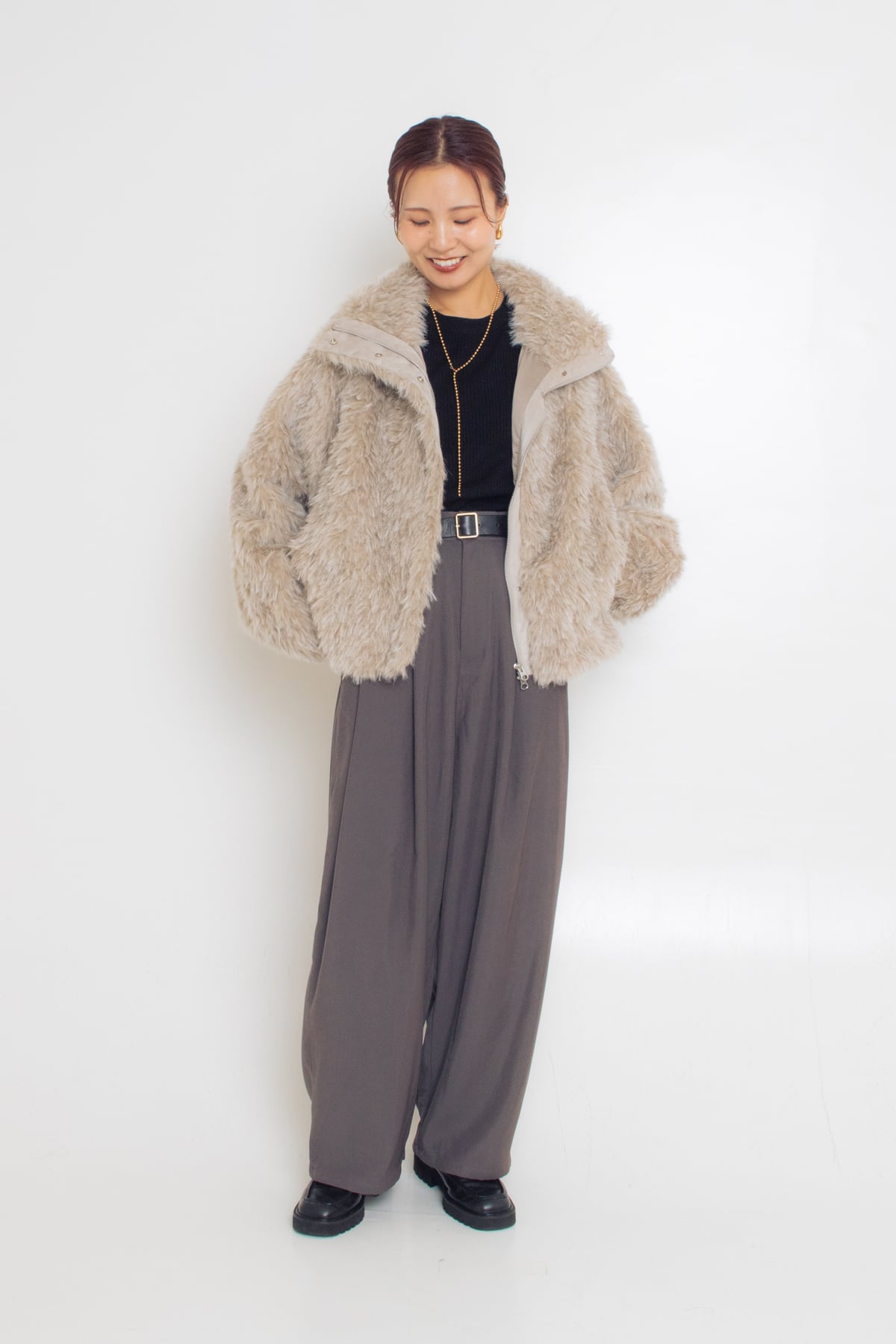 かなりゴージャスな雰囲気のファージャケット。毛並みが最高に気持ちいいんですよね。襟付きでジップがついているので、きれいめにまとまりすぎないのがいい。気軽に羽織れるファージャケットです。これわたしも欲しい♡!