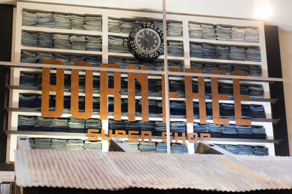 若林:今回のために思い出してたんやけど、色々あったんやろうけど覚えてるのは、お店の天井近くにあるジーンズの壁のことかな。ここのオープンの時にジーンズを集めてそれを山のように積んでたのを、色ごとに分けようって言って、それこそ1,000本くらいをグラデーションに並べたりしてたね。壁に埋める前にね。