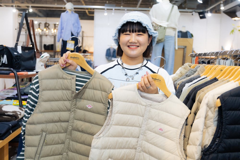 オススメは定番のDANTONのインナーダウンですね。あとFRED PERRYのスウェットも割と色展開が多いですし、そちらもオススメです。エイスクエアはanukeもあるので、デニムのジャケットやベロアのワンピースも可愛いなと思っています。